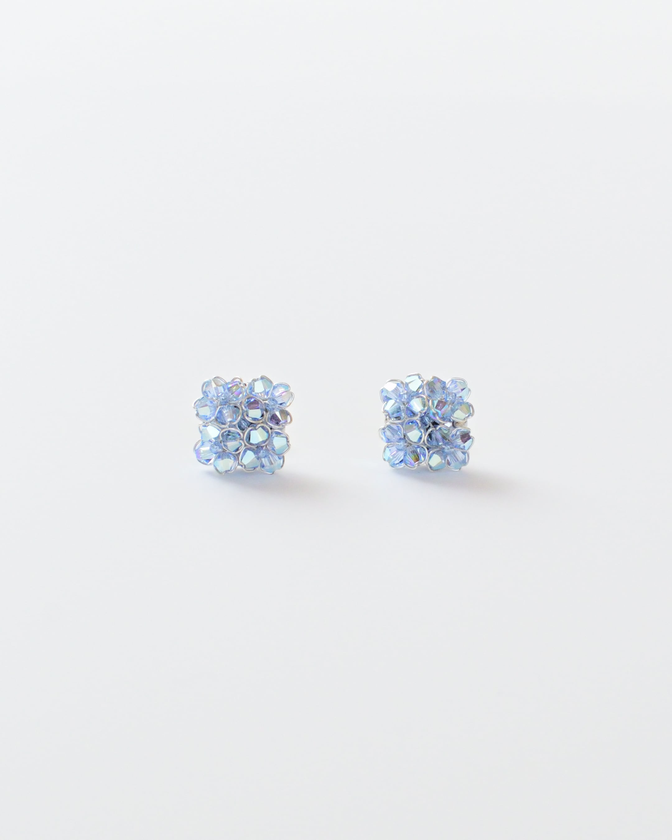 水色の高品質なヨーロピアンクリスタルビーズを編んで作られた紫陽花のモチーフ。それを用いたスタッズピアスは、耳元で華やかに煌めきます。